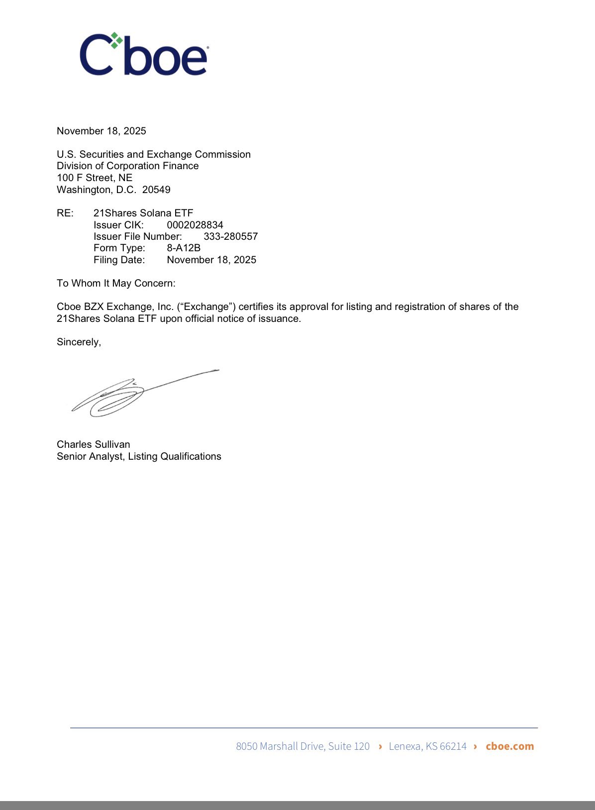 Shortly after the filing, the website of the SEC showed that the exchange Cboe has approved the listing and registration of the fund. This basically allows the launch of the product.