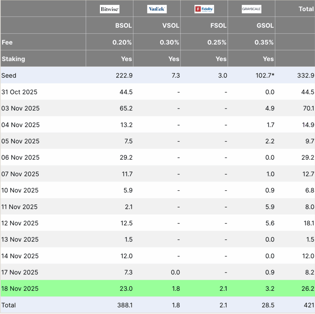 Inflows for the token have continued despite the market dip. On November 18, SOL ETFs posted net inflows of $26.2 million. Bitwise’s BSOL led the flow with $23 million in inflows. This marks the 15th consecutive trading day of positive inflows. This is while both Bitcoin and Ethereum spot ETFs recorded new rounds of outflows.