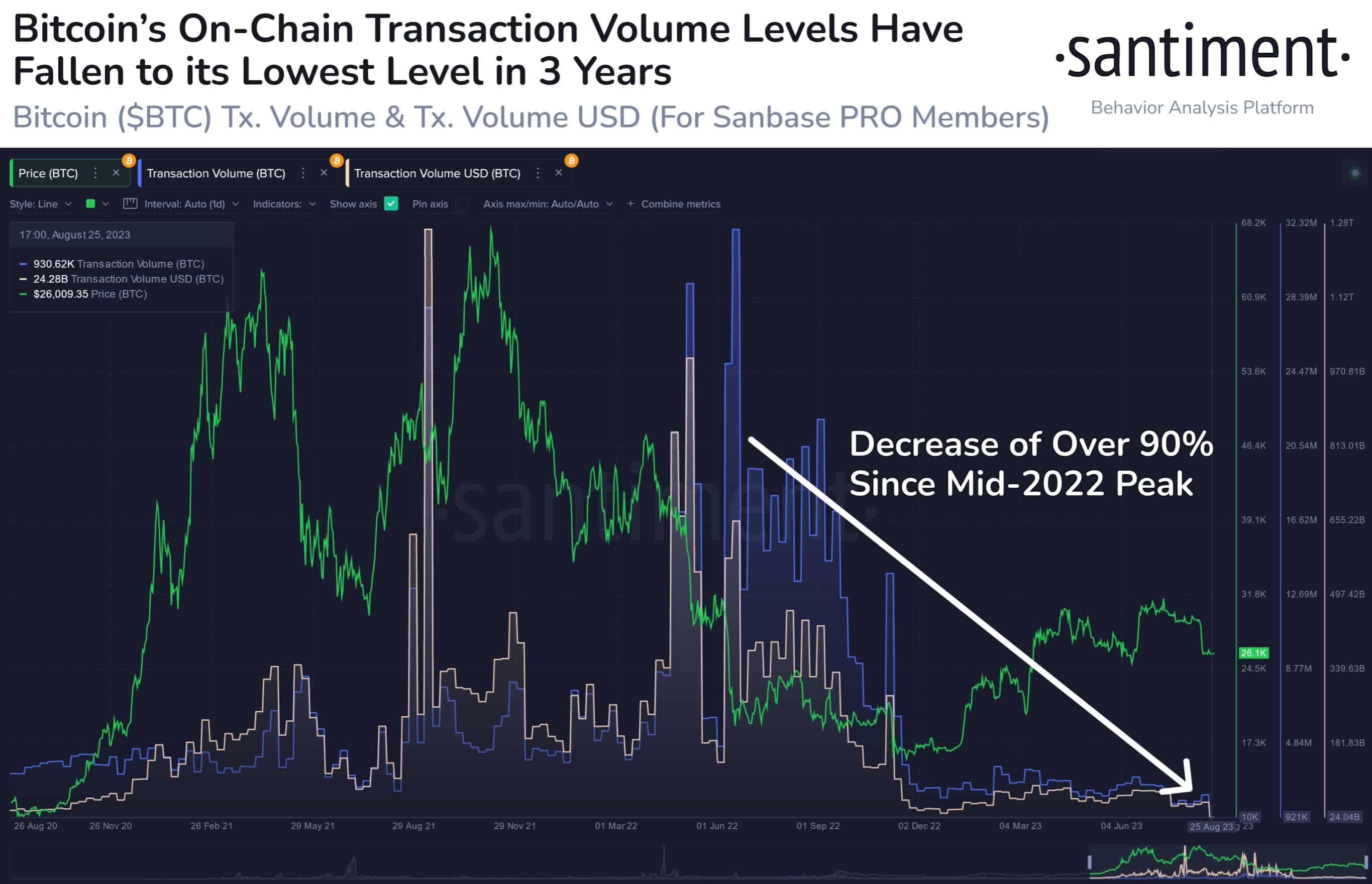 On-chain data shows that the transaction volume for Bitcoin has dropped to its 3-year lows. As per the data from Santiment, this includes the amount of peer-to-peer payments, miner fees, exchange fees, and withdrawals.