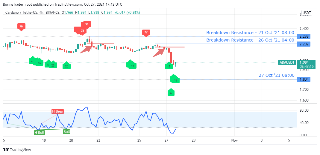 The 4HR time frame shows the RSI overbought readings as confirmation into the downtrend on the daily time frame. In addition to the overbought levels, price breakdown of inside bar supports on 21 Oct 08:00 and 26 Oct 04:00 reinforce the decision to short the ADA token from an intraday level.