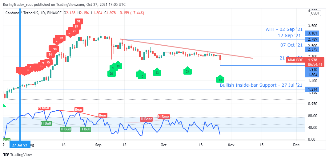 The above daily time frame shows the ADAUSDT enter a descending triangle chart formation following a prolonged uptrend on 27 July ’21.