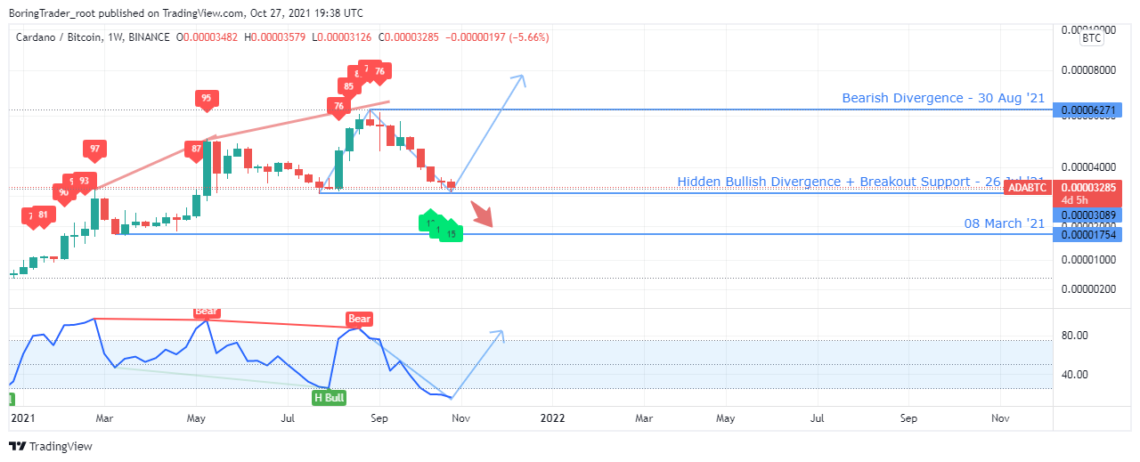 The ADA vs. BTC chart overhead shows an increase in demand for Bitcoin BTC over the ADA token and now trading above a previous support level as the RSI prints values below level-25.