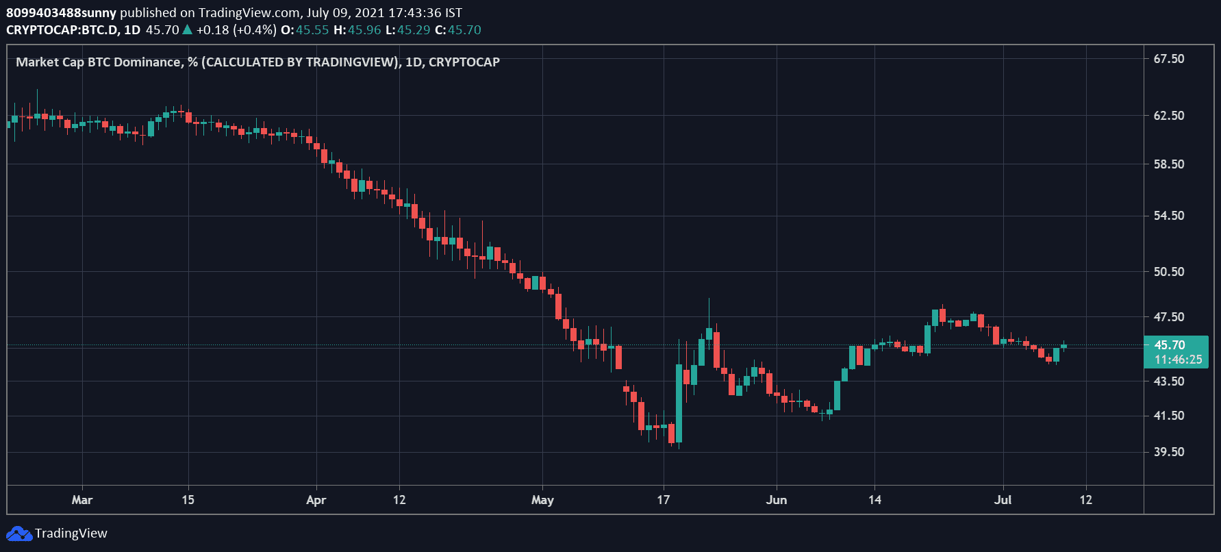 Bitcoin market dominance is currently at 45.1% and had dipped to its yearly low of 39% in the month of May. Earlier, the analyst had said that if Bitcoin dominance falls below 30%, people should start taking their profits.