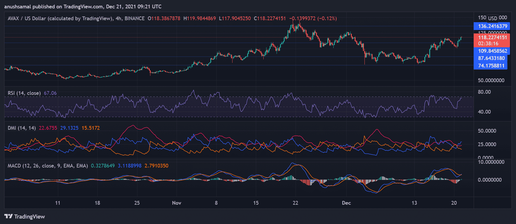 Avalanche’s price action has soared a couple of times this week; over the last 24 hours, the bulls embarked on yet another upward ride as it logged in a 10.1% gain. At press time, the coin was trading at $118.22. In the last week, AVAX registered a massive ROI of 50%. The chart shows that AVAX has held itself well above its strong support line of $74.17.