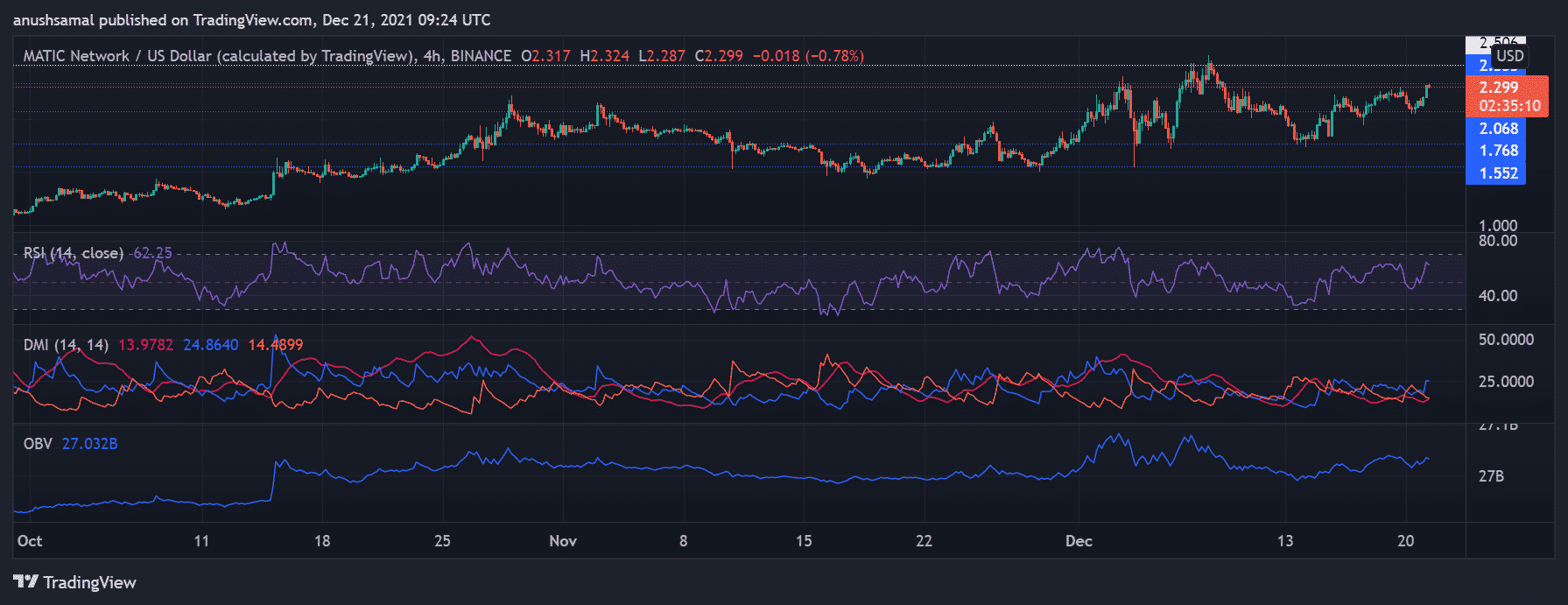 Matic’s price action over the month was quite dynamic as the coin dipped and propelled right after quite a several times. At the time of writing, the coin was exchanging hands at $2.29. The overhead price resistance was at $2.70, and a fall below the current price level would cause MATIC to trade near the immediate price floor of $2.06.