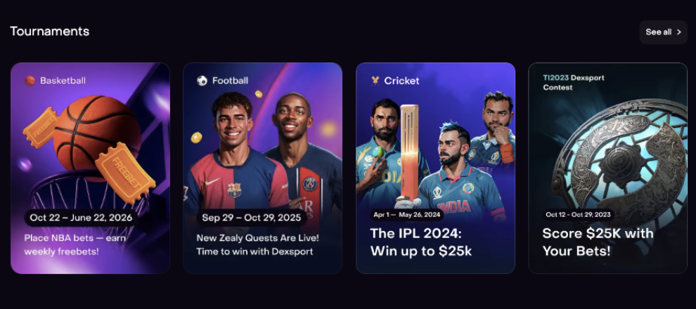 Dexsport is probably the closest you’ll get to a fully decentralized betting experience in Canada right now. You don’t need to create an account as expectd in the traditional settings. All you need to do is to just connect MetaMask, Trust Wallet, or even hop in through Telegram. No email forms, no ID uploads, nothing. You’re basically ready to place a bet within a few seconds of visiting the Bitcoin casino site.