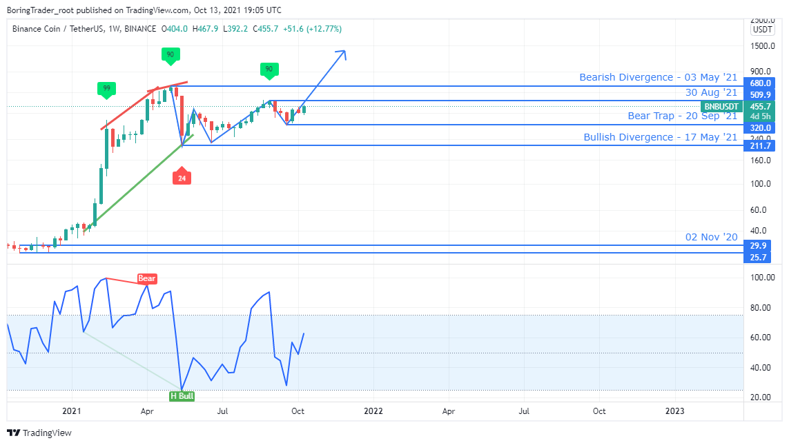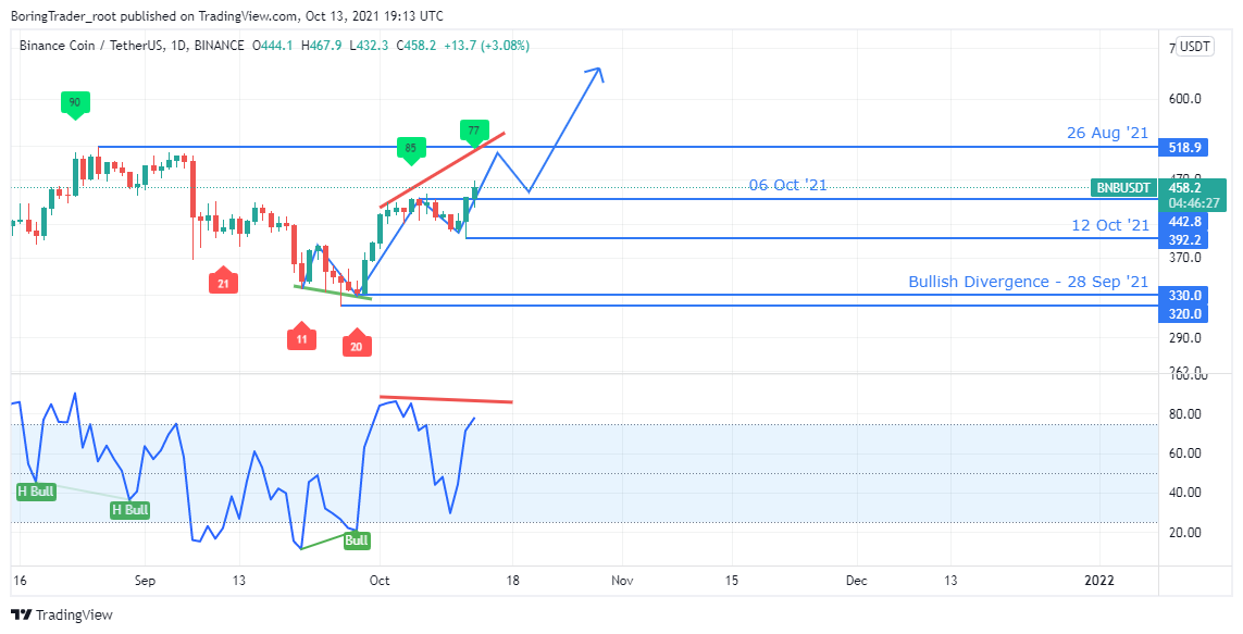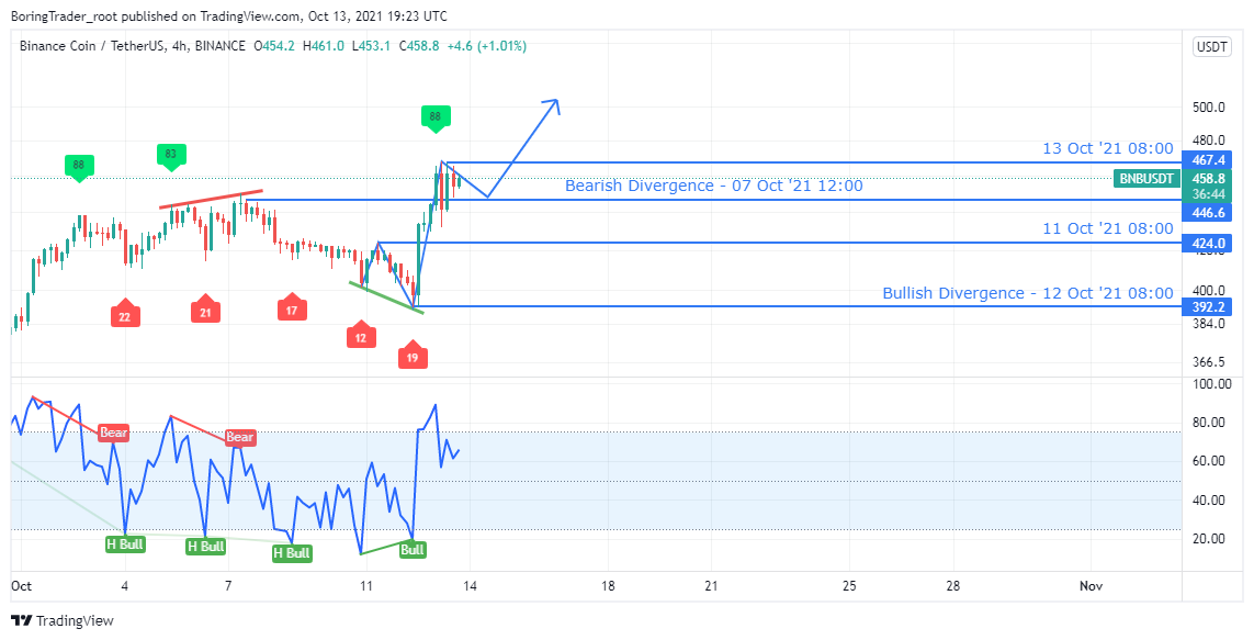 The 4HR time frame follows a similar price dynamics as the daily time frame with an opposing regular bullish divergence on 12 October ’21 at 08:00. This led to a parabolic upswing for the BNB price and soaring above the 07 October 12:00 resistance [$446.60].