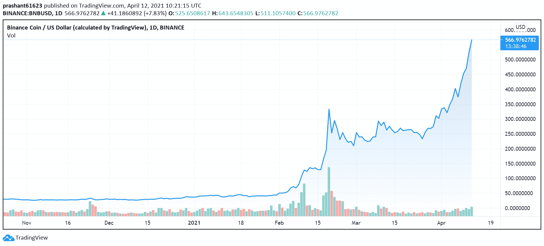 The massive price rally of BNB above $600 saw the altcoin register a higher daily trading volume than Bitcoin itself. This is quite a feat considering BNB is just a utility token and was trading under $50 just a couple of months ago.