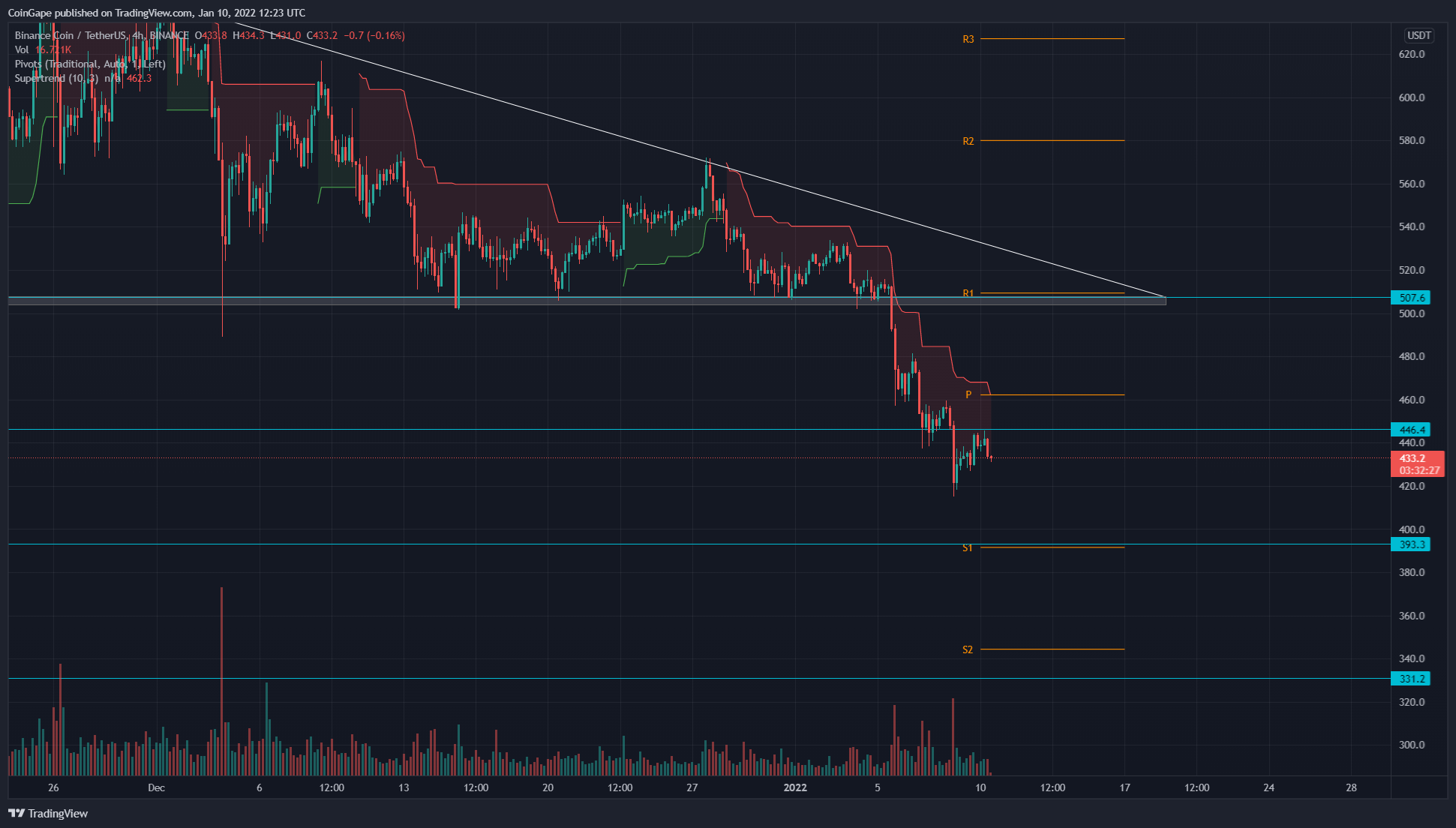 During the last two months of 2021, the BNB price was trying to sustain above the $500 support. However, entering 2022, the coin sellers took the lead and dropped the price below this crucial support. The bloodbath in the crypto market fueled more selling pressure and dumped the price to the $427 mark.