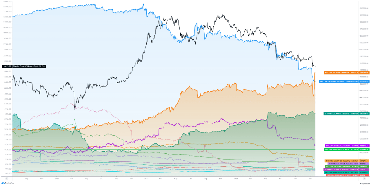 When this metric’s value increases, it indicates that investors are currently depositing their coins to the exchange. On the other side, a decline means that holders are currently withdrawing their BTC from that exchange. Here is a graph that displays the trends in the reserves held by the major market platforms for Bitcoin over the past few years.