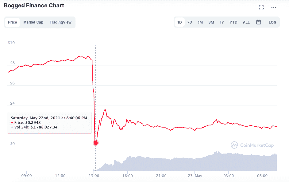 The Bogged Finance (BOG) token price crashed 98% dropping from $8.6 all the way to hitting an intraday low of $0.29. However, the BOG token price has pulled back from the low and is currently trading at $1.95 with a market cap of $4.5 billion.