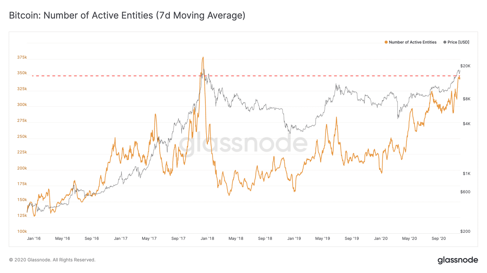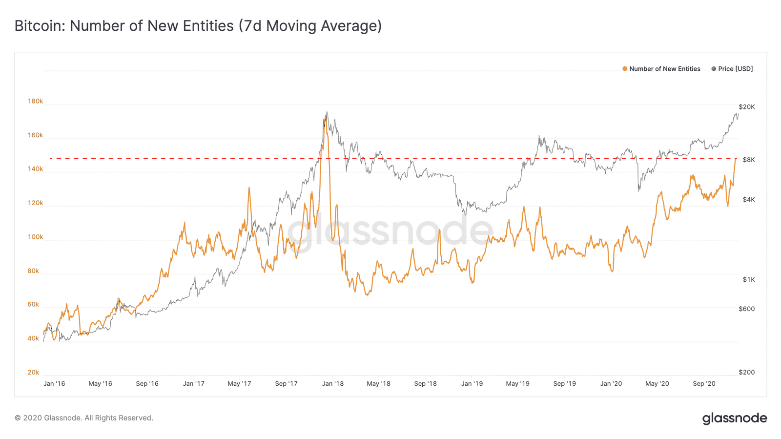 The on-chain data suggest that the price rally is still driven by institutional players since the number of new entities is comparatively low than in 2017 despite the constant rise. This suggests that the ongoing price rally is being primarily driven by institutional players than retailers.