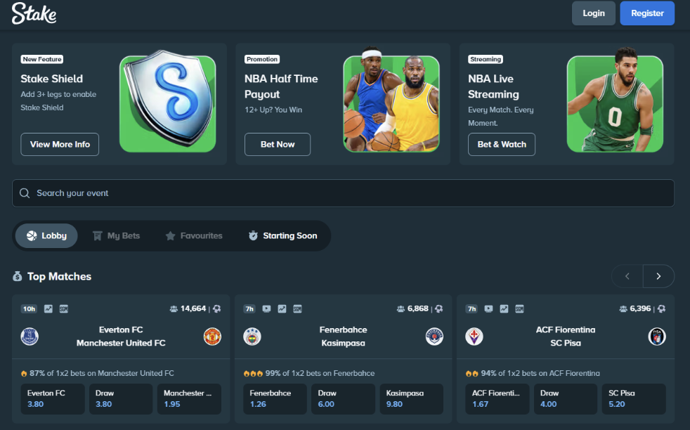 Supporting over 30 markets, Stake offers betting opportunities on a wide range of sports, eSports, and horse racing. The betting ecosystem is sleek, with live betting also available covering some of the biggest sports.
