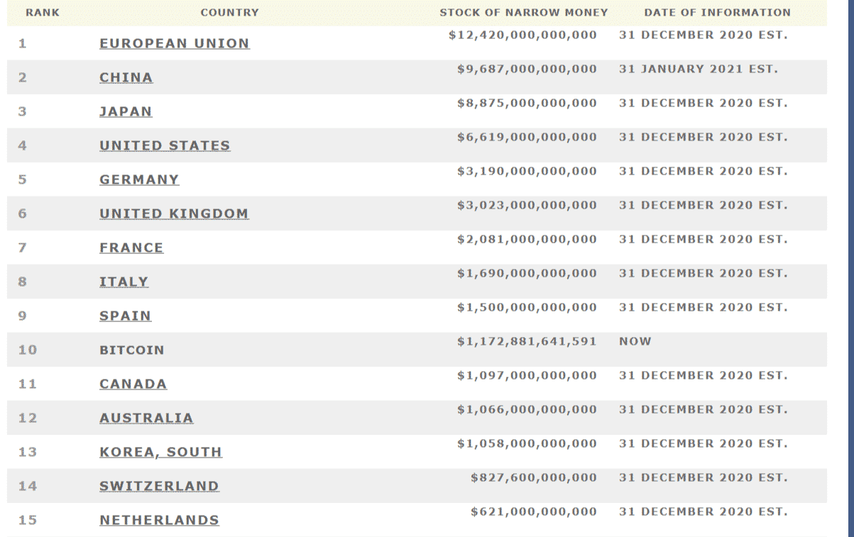 Bitcoin ($BTC) price today registered a new ATH of $63,861 after a month-long consolidation phase. The rising price of Bitcoin along with its market cap has made it top-10 list of largest currencies by M1 Market Supply, leaving behind the likes of the Canadian Dollar (CAD) and Australian Dollar (AUD) to make it to the top-10 list of global currencies.