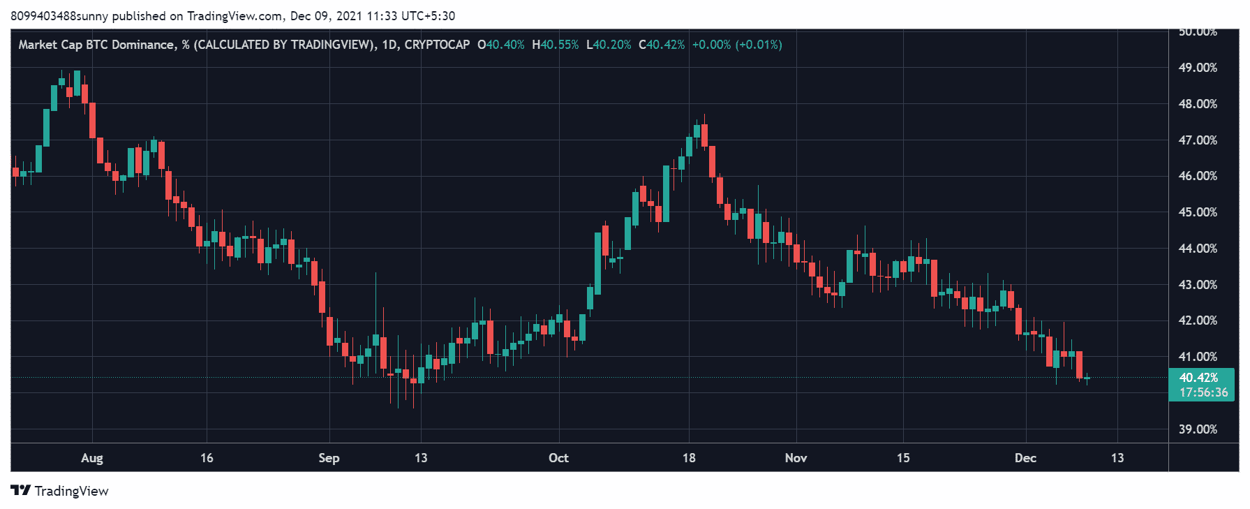 During the mid-year market crash in May-June, BTC flirted closely with the 40% mark and was on the verge of tipping below, but managed to make a recovery when the bulls arrived again. However, the BTC dominance had recovered above 40% at the time of writing and was at 40.42%.