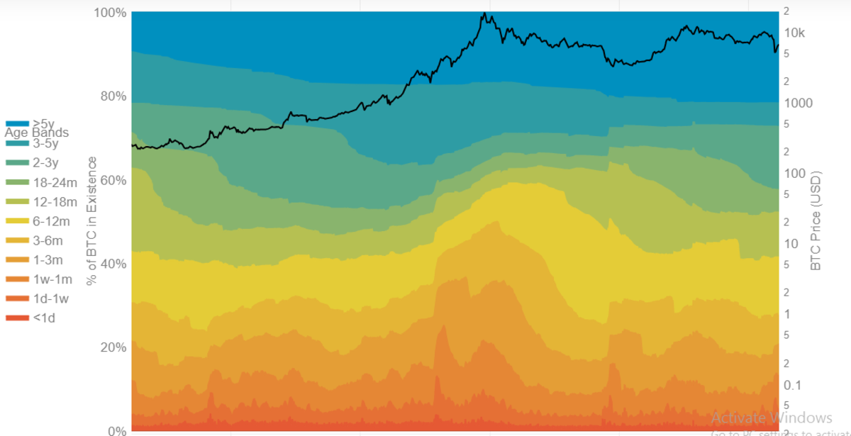 Bitcoin uses a weird kind of structure called the unspent transaction model which shows the last time a coin was used in a transaction. This UXTO model has allowed researchers to classify the cryptocurrency in waves of time the coin has spent in a dormant wallet account. The chart below shows the short term (warm) waves of UXTO i.e. 1-day, 1-week, 1-month bands and the longer-term (cooler) waves i.e. more than a year, 2-3 year waves, 3-5 year waves and those held over 5 years.