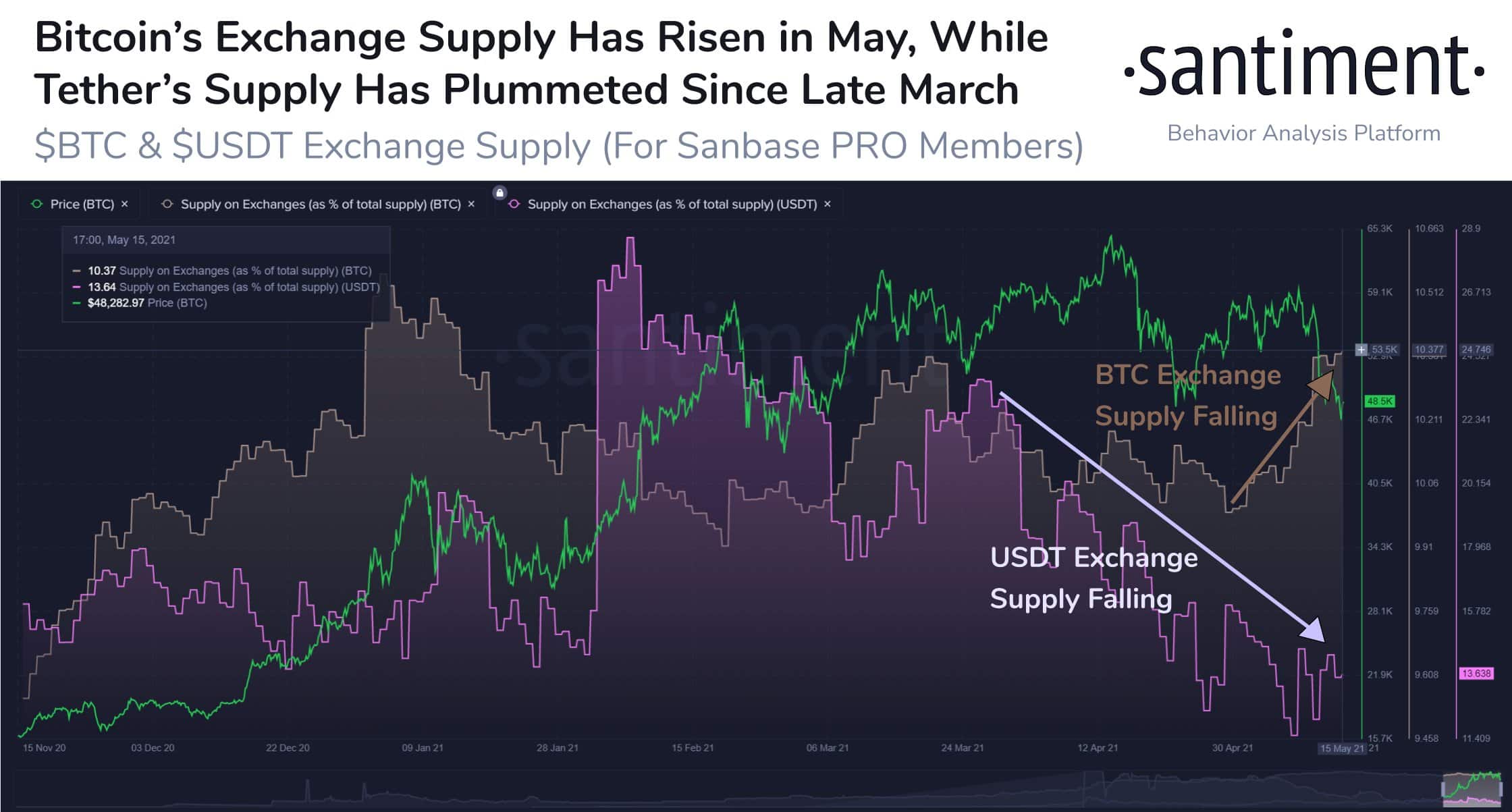 “The supply of #Bitcoin sitting on exchanges is currently back to its highest level since January 14th. The 4-month high is indicative of fear, and the supply of #Tether being near a 2021-low is also an indication traders are hesitant to buy this dip.”