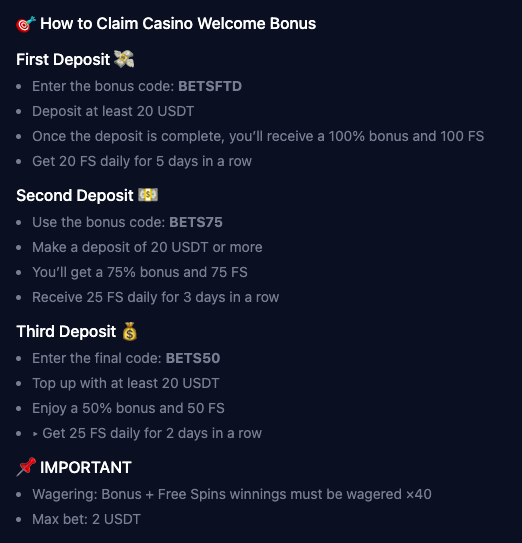 | Bonus System | Welcome pack: 200% up to 20,000 USDT; randomized free spins on deposits; 10% weekly rakeback; specific promos (e.g., 20 free spins on Chicken Road Ice with $50+ deposit) |