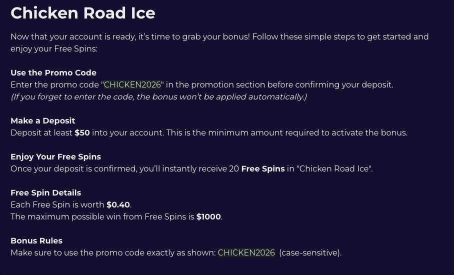On some platforms, bonuses are applied automatically. In other casinos, you may need to select the option in the promotions section, or activate using a given code. For example, Crypto-Games casino requires you to activate 20 free spins by keying in a code: CHICKEN2026