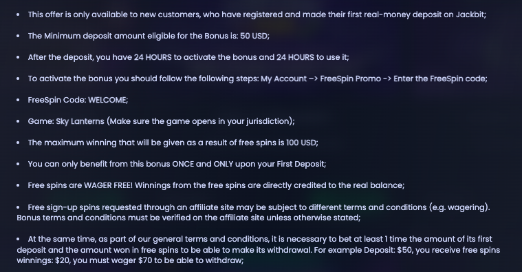Example: You can win 100 free spins on Jackbit casino on Sky Lanterns after depositing $50. Only 1x wagering is required on winnings.