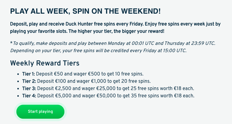 Instead, free spins are earned through ongoing promotions, in this case Weekend Spins. When you play slots from Monday to Thursday, you unlock free spins every Friday, usable through Sunday. Spin amounts scale by activity tiers, with higher tiers unlocking wager-free spins paid as real cash. This is often on featured slots like Duck Hunter.