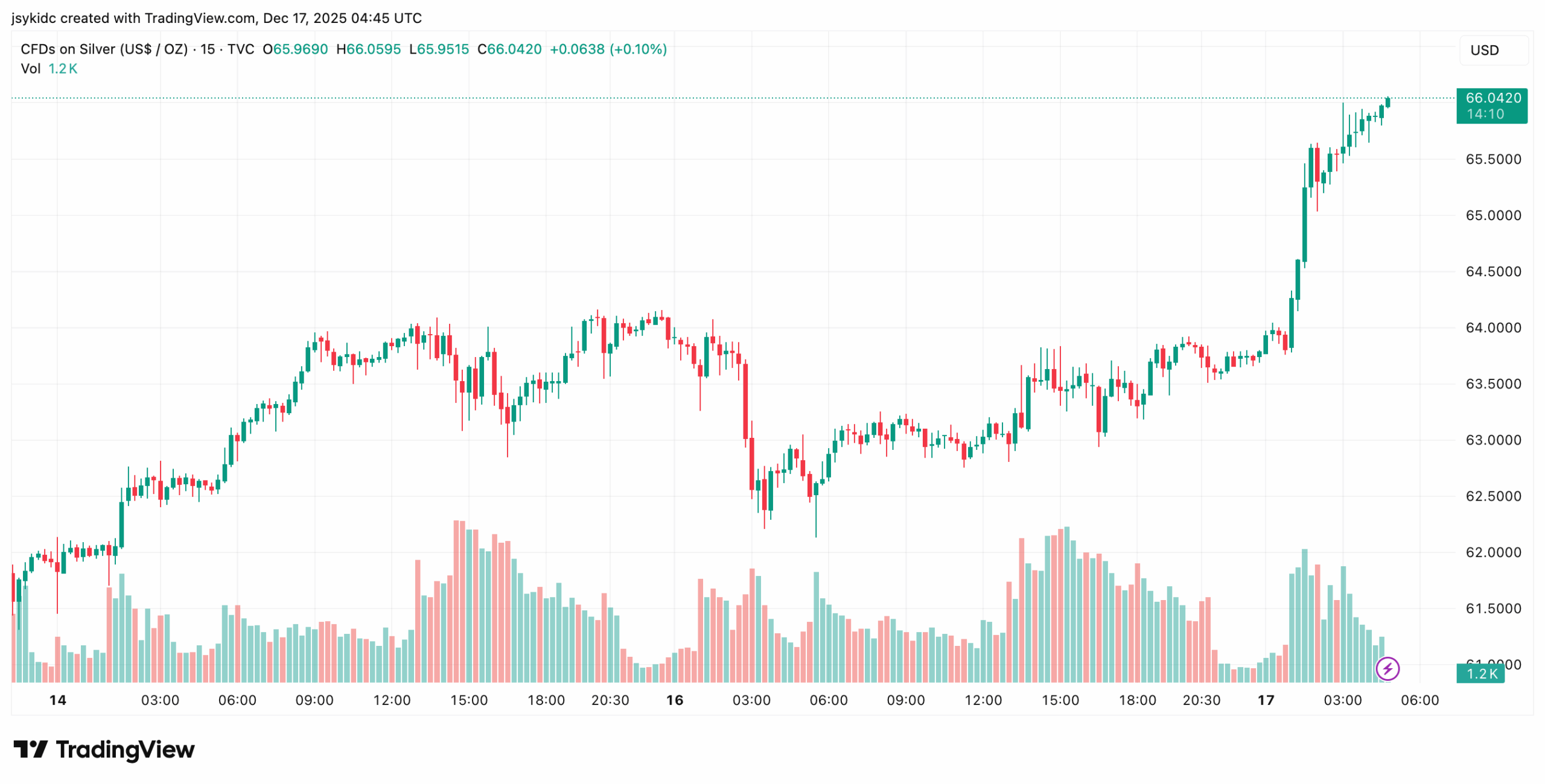 Schiff made these remarks amid sharp gains in silver which gained above $1.60 within a single trading session. The rise took the metal beyond $66, a record high, as gold moved above $4,300.