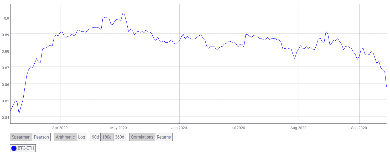 This was indicative of the fact that Ether had been the highest-correlated cryptocurrency to Bitcoin than for more than two years, with an average correlation coefficient of 0.9. But this trend appeared to be heading for a reversal. At the time of writing, the 6-month BTC-ETH correlation coefficient dropped to 0.85. According to the CoinMetrics chart attached below, the correlation coefficient dropped to a level that was last seen on the 14th of March this year.