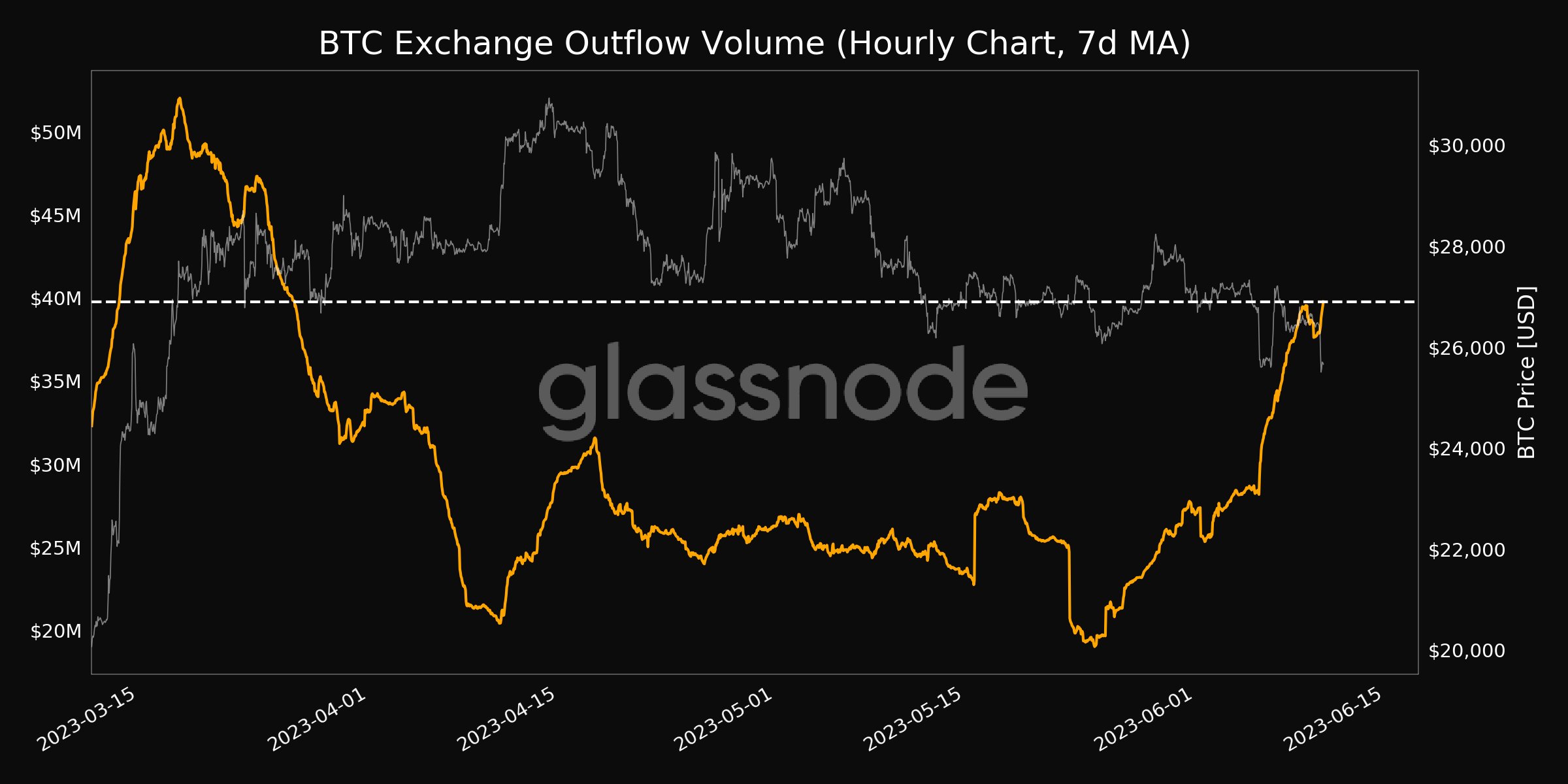 According to Glassnode’s on-chain data, Bitcoin’s Exchange Outflow Volume (7d MA) has surged to a 1-month high of $39,781,339.94. This figure surpassed the previous 1-month high of $39,556,958.79, recorded on June 9, 2023. The term “exchange outflow” refers to the total amount of Bitcoin being withdrawn from centralized exchange wallets.