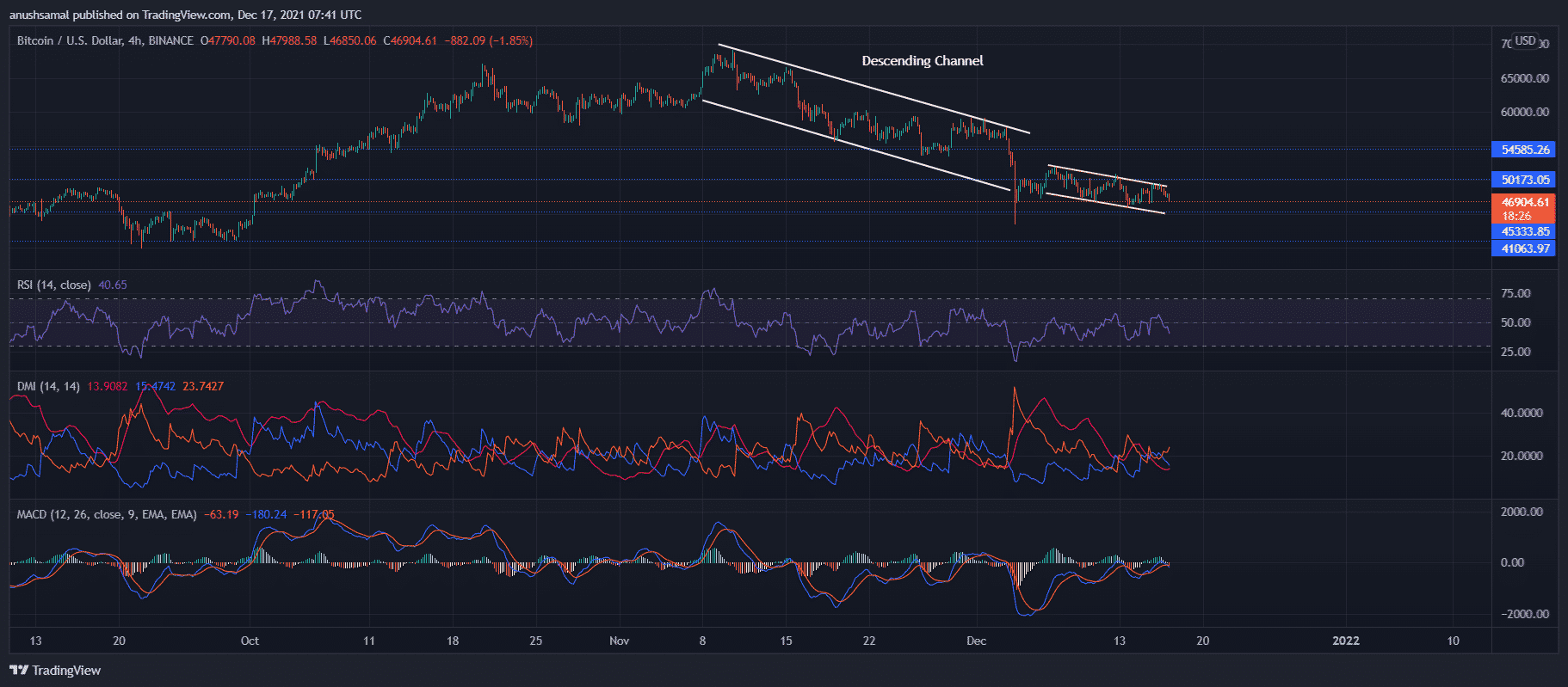 Bitcoin had been trading within a descending channel (white) since November 8; post flashing signs of recovery in the last week, Bitcoin went back to traversing within the descending channel (yellow). The near-term technical of Bitcoin highlighted that bearish price action.
