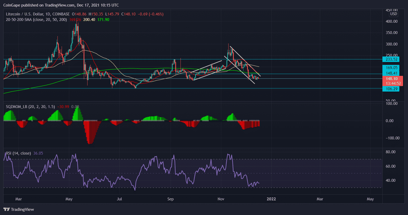 Litecoin’s price action took a hit right after the token was trading within an ascending price channel. The token’s price made a bearish drift as the broader market witnessed an adverse price action. At the time of writing, the coin was trading for $148.10, and the token fell by 4.7% in the last 24 hours. The price of Litecoin was seen trading above its multi-week support line of $148. The bears have taken charge of the price action from the technical indicators. Immediate resistance of the coin stood at $148.41 and then at $169.05.