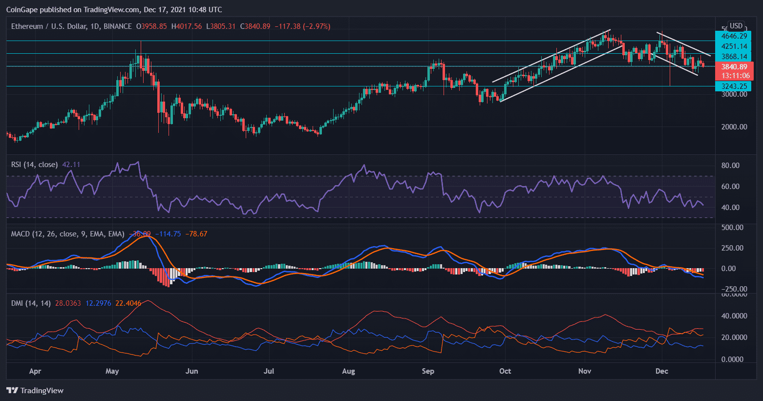 Ethereum’s current price was on a reversal after trading in an up-channel for the past few months. Ethereum’s prices have been dominated by the bears for most of this month. At press time, the alt-king traded at $3840.89 after registering 4.9% depreciation over the last 24 hours. The immediate support level stood at $3243.25, and Ethereum struggled to move over the $4646.29 resistance level. As the altcoin fell on its charts, it met with a sell-off over the last multiple weeks. The immediate price resistance stood at $3868.14 and then at $4251.14.