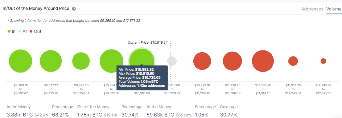 On the downside, the bellwether cryptocurrency is sitting on an area of immense support. For instance, the demand pressure between $10,582 and $10,910 is strong enough to absorb most of the selling pressure in the event of a rejection from current price levels. Here, 1.42 million addresses previously purchased 1.03 million BTC.