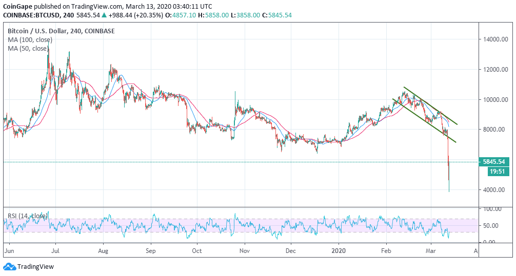 The breakdown, which started late February after Bitcoin price hit its 2020 peak at $10,533 was linked to the deadly Coronavirus. However, market volatility and panic took advantage to force one of the worst selloffs in the cryptocurrency market with Bitcoin nosediving to $3,864 Intraday low on Coinbase).