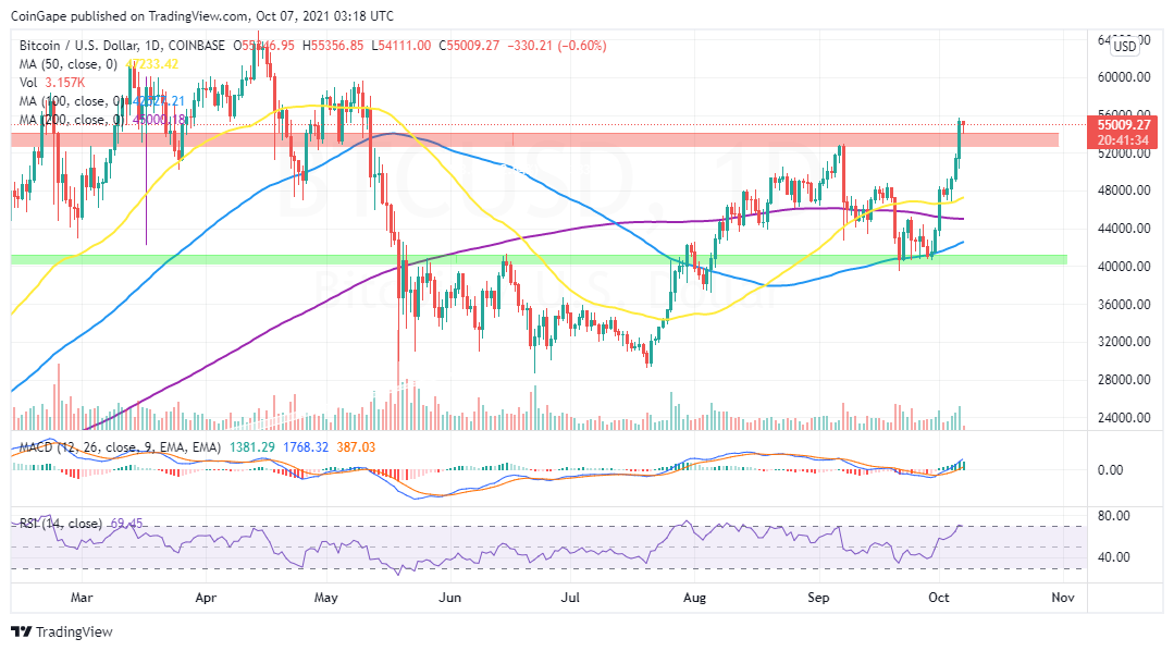 Bitcoin has kept its October winning streak Intact. Although the bellwether cryptocurrency suffered delays at $51,800, leading to a minor setback, bulls almost immediately regained control, pushing for gains above $55,000 (the critical supply zone marked in red on the daily chart).