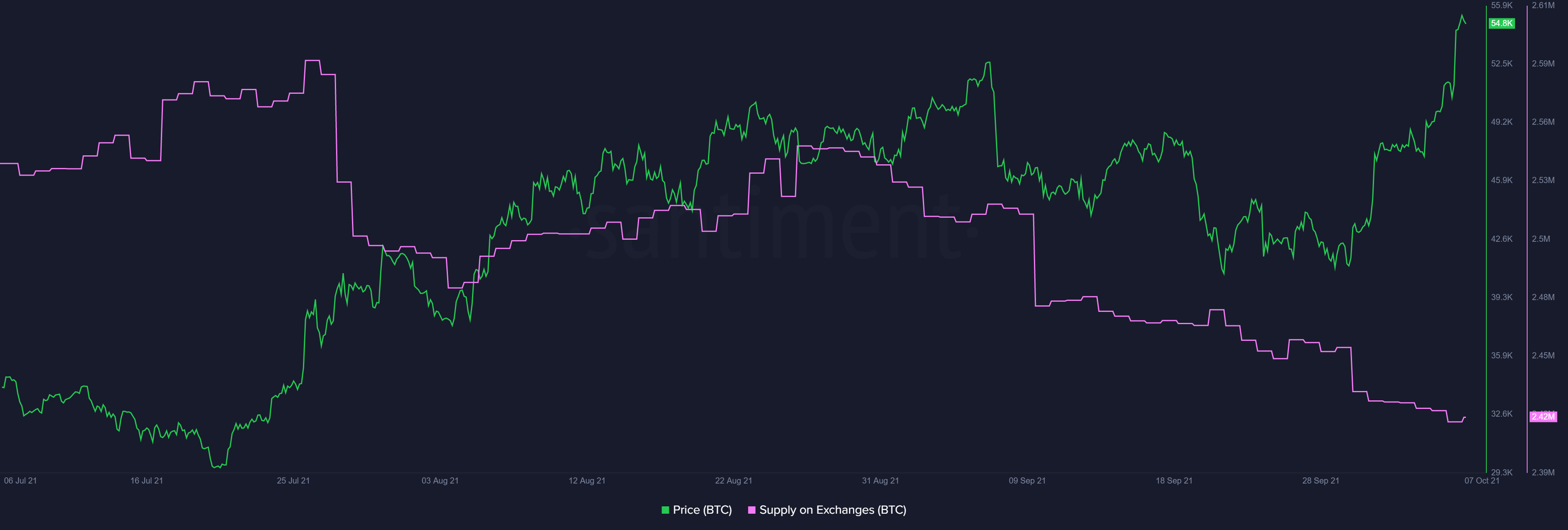 - A falling Bitcoin supply on exchanges could quickly bolster the price above $60,000 as selling pressure fades.