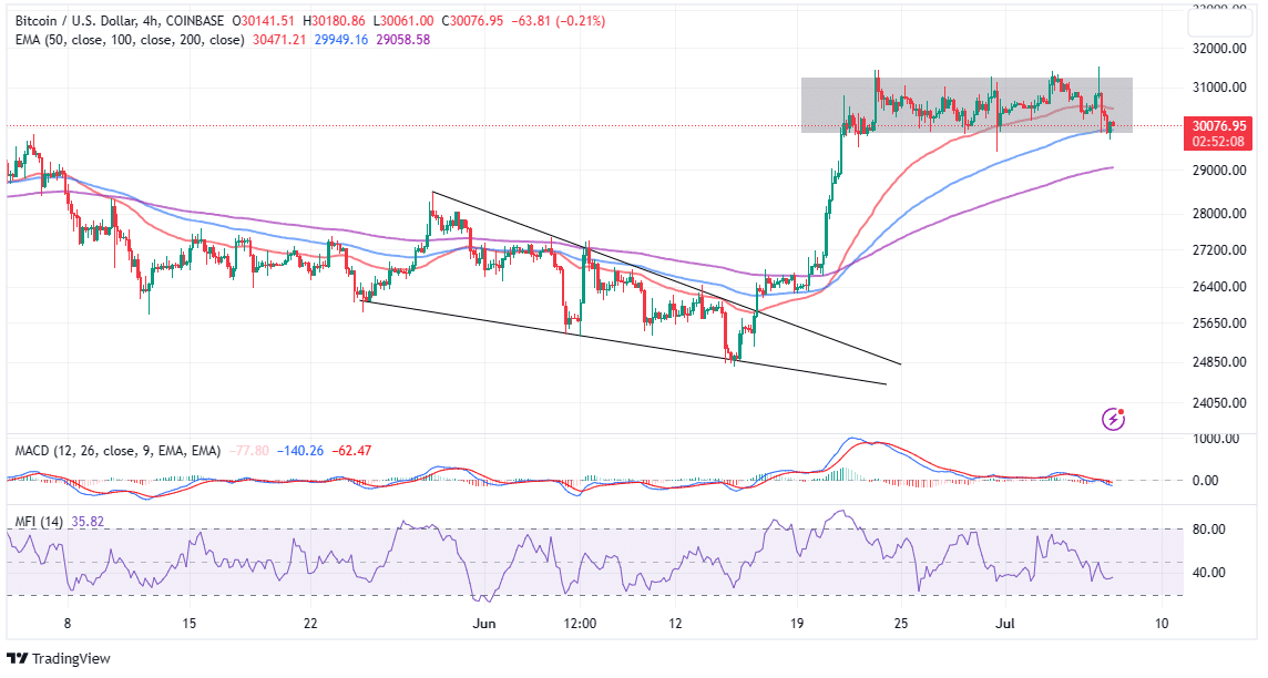 Bitcoin price has delivered a 12.2% upside in the last 30 days after factoring in the correction from its 12-month high milestone of slightly above $31,500. However, the same upside is starting to come under increasing pressure, especially if the immediate support at $30,000 crumbles, letting bears through.