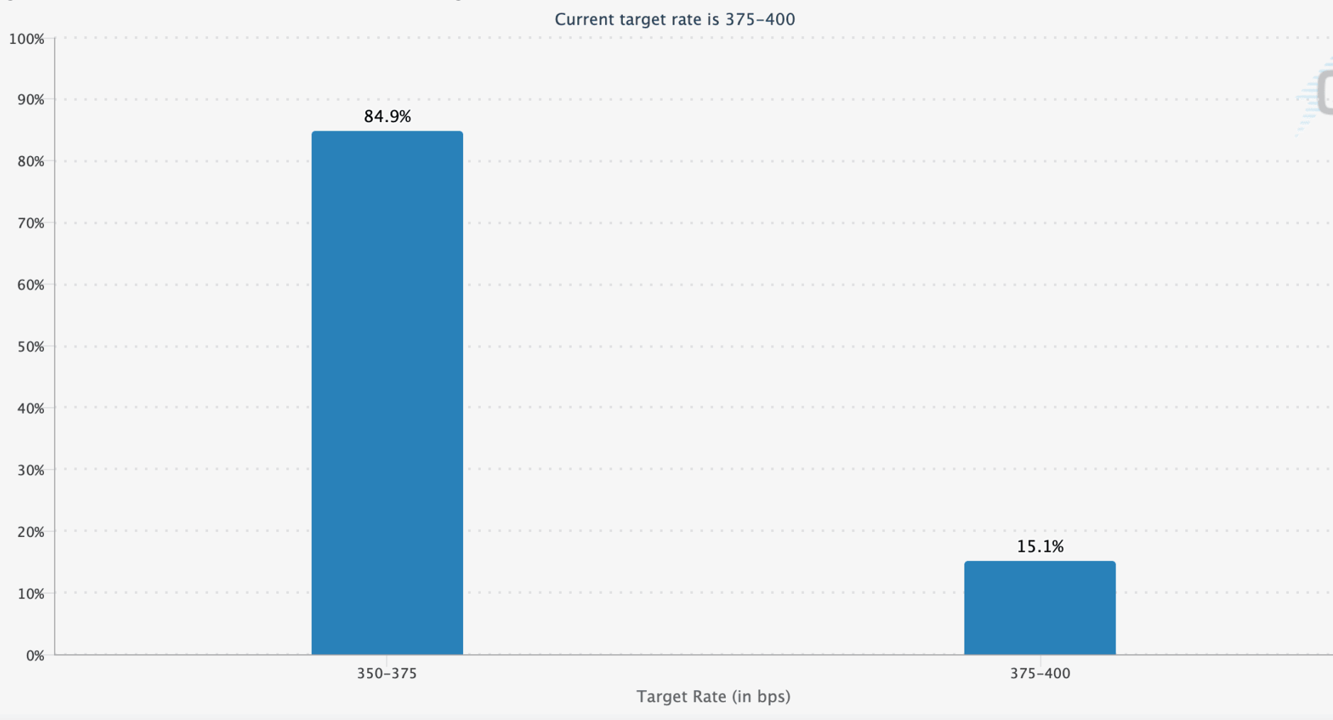 Meanwhile, the futures markets believes the Fed will lower rates. According to CME FedWatch data, traders now see an 84.9% chance of a another rate cut in December.