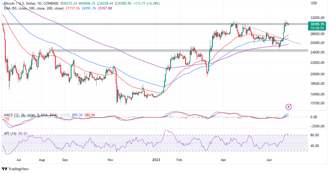 Bitcoin price, although not climbing the ladder to the coveted $38,000 resistance level, it is sustaining its position above $30,000. Bulls seem to be at ease, with consolidation allowed to take precedence ahead of an anticipated breakout above the 12-month high of $31,428, according to price data as tracked by CoinGape.