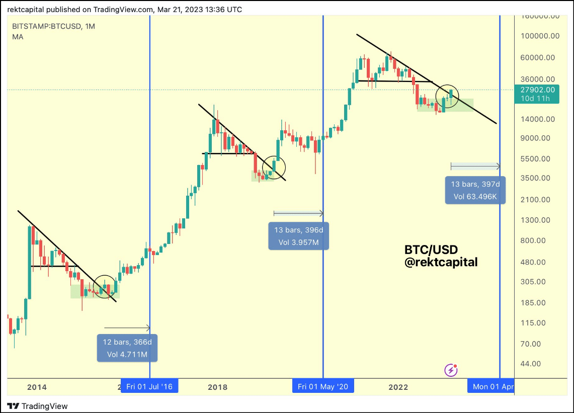 According to a prominent crypto analyst, who goes by the pseudonym Rekt Capital on Twitter, published a study on Bitcoin’s price which entails a brewing upward rally for the world’s first cryptographic asset. At the moment, Bitcoin (BTC) has been seen to break past its downtrend, although it is yet unknown whether or not this can be maintained until the end of the month.