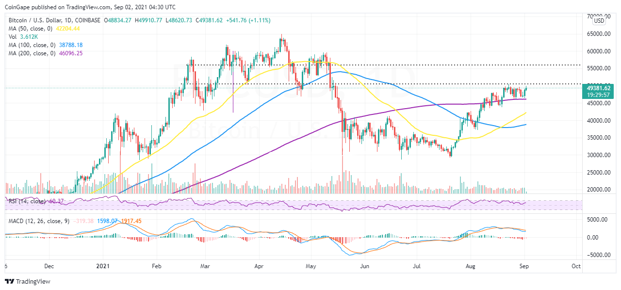 - Bitcoin knocks at $50,000 after a lock-step trading from the key 200-day Support around $46,000.