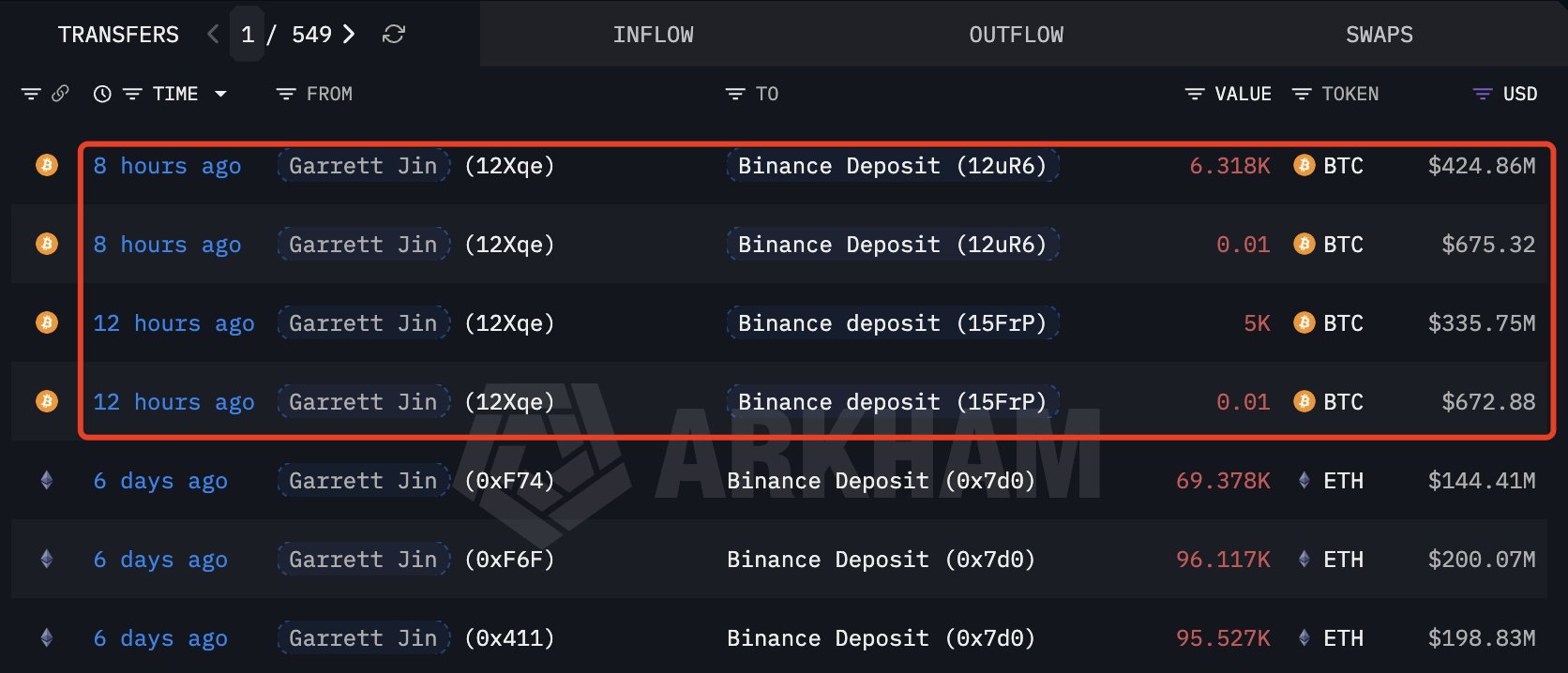 According to Lookonchain, Garrett Jin transferred $760 million worth of the coin in a large transaction. The trader transferred 6,318 BTC, valued at around $425 million, to Binance. This is in addition to a series of transfers that have caught the attention of blockchain researchers.