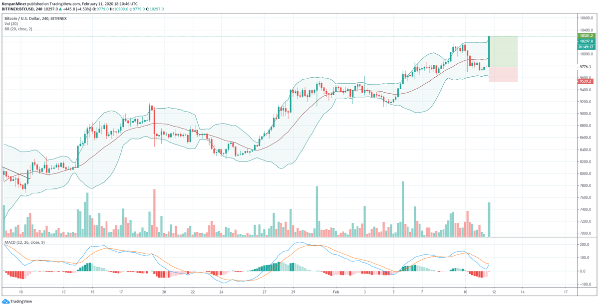 Looking at the 4-hour charts, the price soared above the near term resistance provided by the SMA 50 on the Bollinger Band (BB), and bursting through the upper Bollinger Band to currently trade at averagely $10,301.89 against the dollar on major exchanges. The spike in price is on the verge of forming a golden cross on the lower timeframe charts as the Bullish run looks set to continue in the near future.