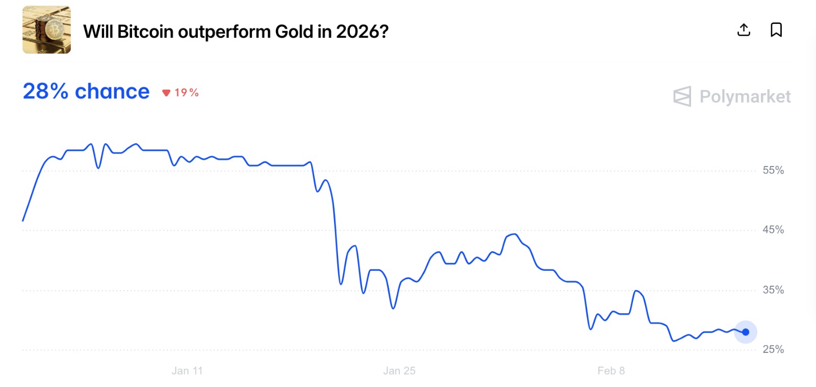 Others have also been scrutinizing Bitcoin’s outlook. According to Polymarket data, traders currently assign a 28% chance that Bitcoin will outperform gold in 2026.