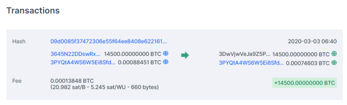 On Tue, 03 Mar 2020 03:47:10 UTC, a Bitcoin whale moved 14,500 BTC (~$129,247,000 USD) from an unknown wallet address to a totally new address, raising questions on the huge transfer. The community is speculating on the possible need for the move of such a huge stash of BTC debating on its market impact vs a HODLing prospect for the whale.