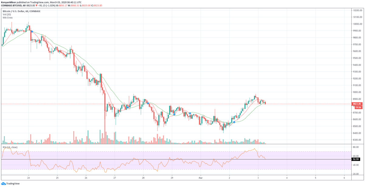 However, the short timeframe charts signals a possible selloff towards the $8,500 USD level with a death cross formation on the hourly charts. The relative strength index (RSI) is also threatening to break support levels at 52.59 and oscillate towards the oversold regions if breached.