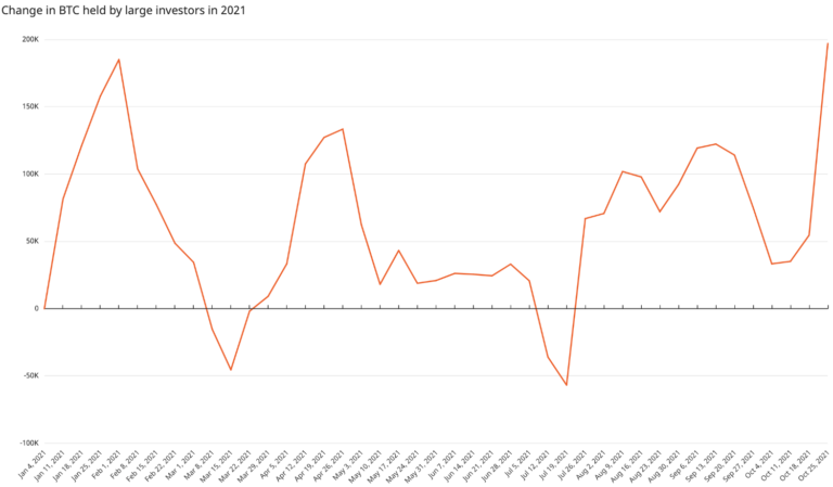 As we can see in the above chart, whales were holdings 185,000 BTC earlier in February but sold during the May period when BTC was around its all-time high levels. But during the last week of October, the BTC whales added a staggering 142,000 BTC taking the total holdings to above 200,000.