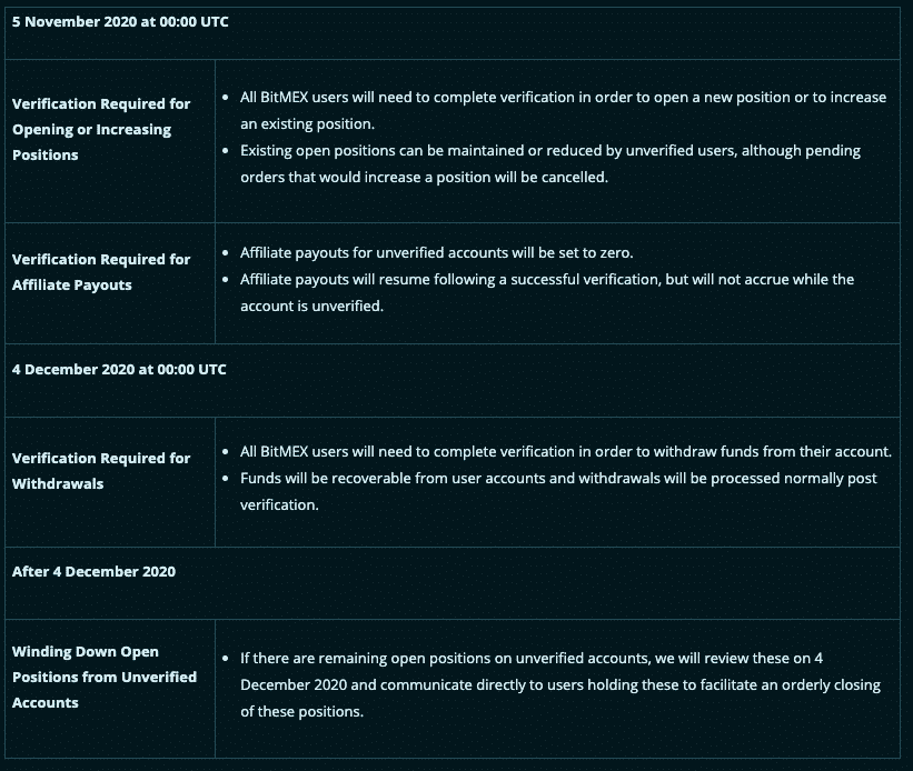 We are accelerating the rollout of our User Verification Program. Users must now be fully verified by 5 November 2020 at 00:00 UTC to continue trading on the BitMEX platform. Further information is available on our blog: https://t.co/C0W2201KH7