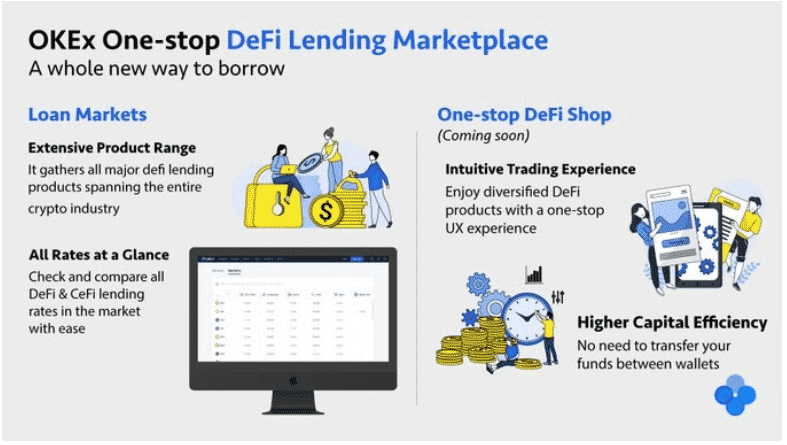 OKEx Earn offers a range of ways to earn interest on crypto assets, combining the best internal CeFi options, DeFi, and staking opportunities to maximize potential. Similarly, OKEx Loan provides access to instant borrow markets from various CeFi and DeFi options in one place.