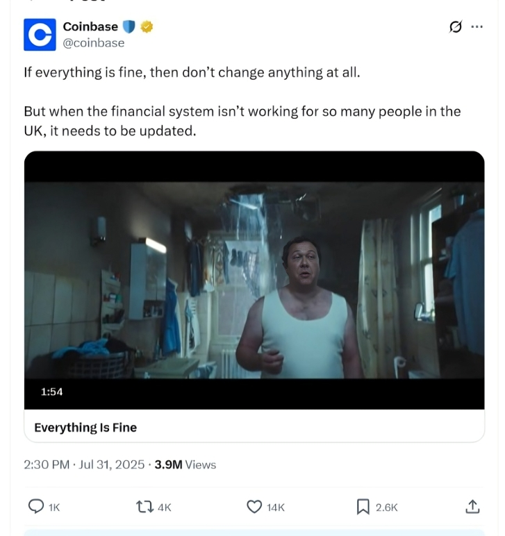 Coinbase’ Ad continues to rake in millions of views. Source: X post