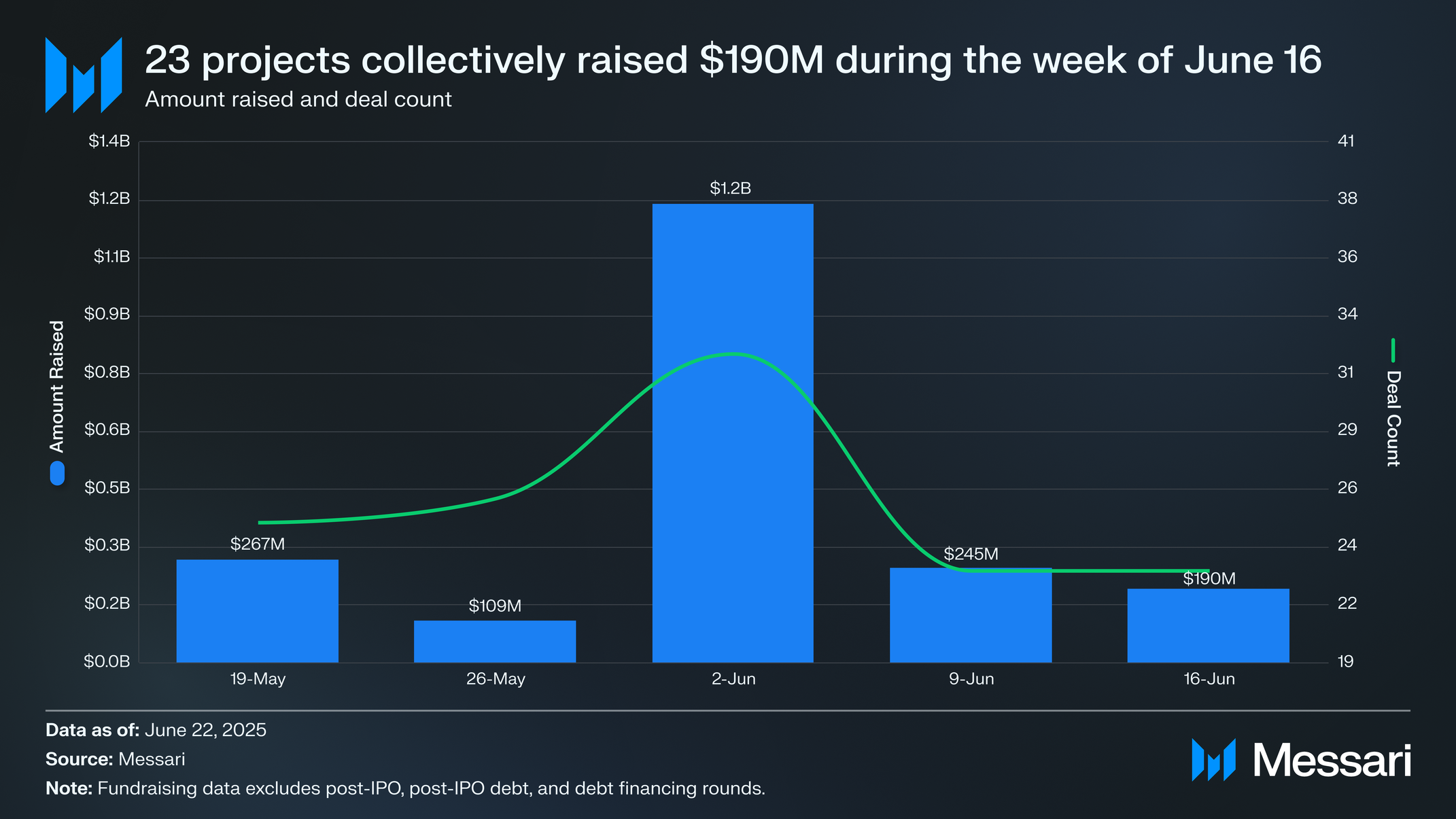 According to the data from Messari, in the week of June 16–22, 23 projects raised about $190 million, led by EigenLabs ($70 M) and PrismaX ($11 M). Further, earlier in Q2, during May 26–31, 25 projects secured $109 million, headlined by Conduit’s $36 million Series A.